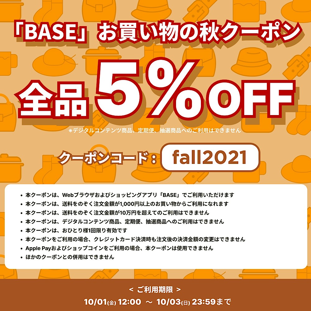 商品購入画面でクーポンコード≪fall2021≫を入力して下さい。